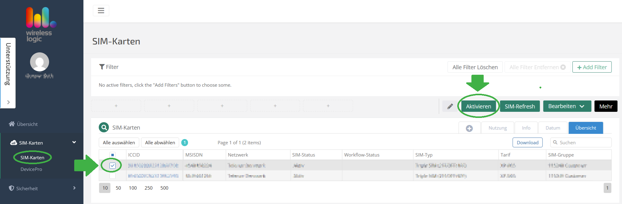 - Klicken Sie unter SIM-Karten auf SIM-Karten, wählen die zu aktivierenden SIM(s) aus und klicken oben auf Aktivieren.