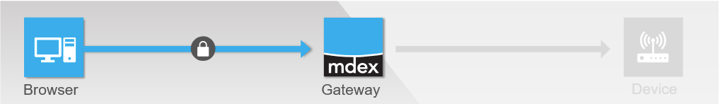Für die meisten Anwendungen wird eine verschlüsselte Verbindung zwischen dem Browser und dem mdex Gateway über den HTTPS-Port 443 empfohlen. In obenstehende Grafik wird dann ein Schloss-Symbol integriert. -