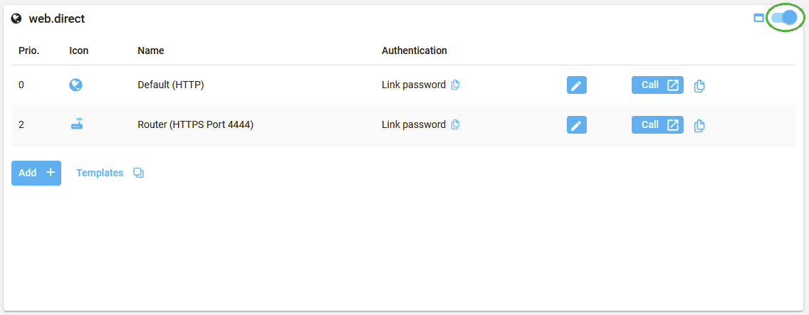 Durch Klicken auf 'Aufrufen' (Call) wird der web.direct Link geöffnet, um auf die Weboberfläche des jeweiligen Geräts zuzugreifen: