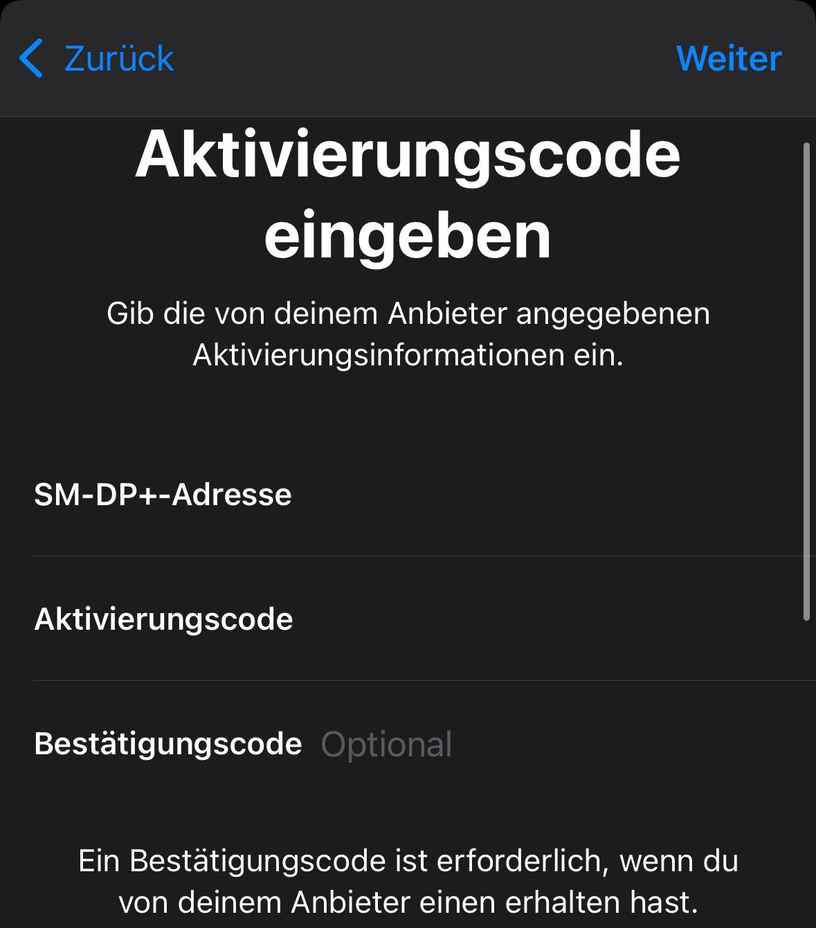 Beispiel:Bereitgestellter Aktivierungscode LPA:1$RSP-XXXX.XXXXXX.XX$XXXXXX-XXXXX-XXXXX-XXXXX SM-DP+-Adresse RSP-XXXX.XXXXXX.XX Aktivierungscode XXXXXX-XXXXX-XXXXX-XXXXX Tippen Sie auf 'Weiter'.