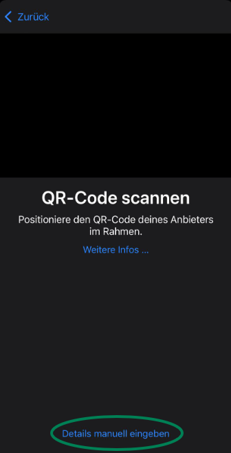 Statt den QR-Code zu scannen, tippen Sie unten auf 'Details manuell eingeben'.