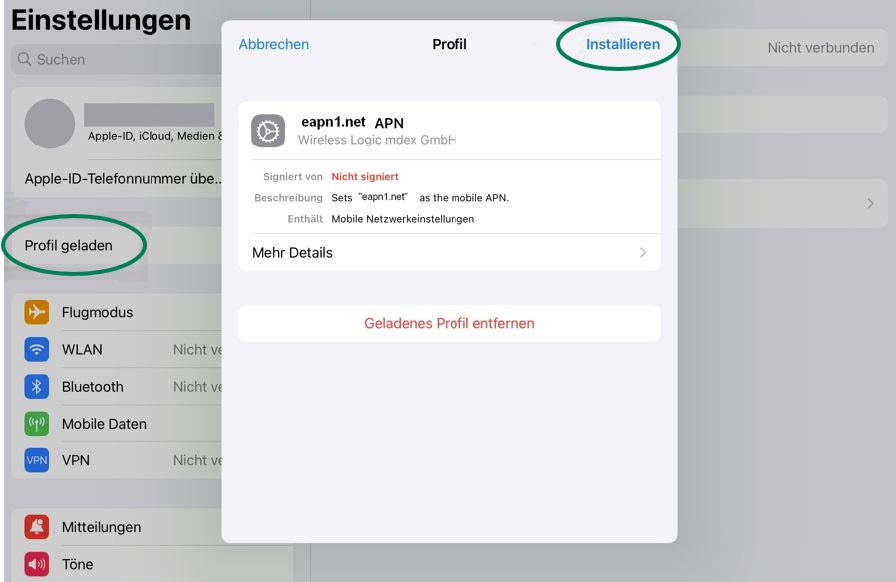 Klicken Sie auf 'Profil geladen' und Installieren Sie das Konfigurationsprofil (siehe Screenshot).
