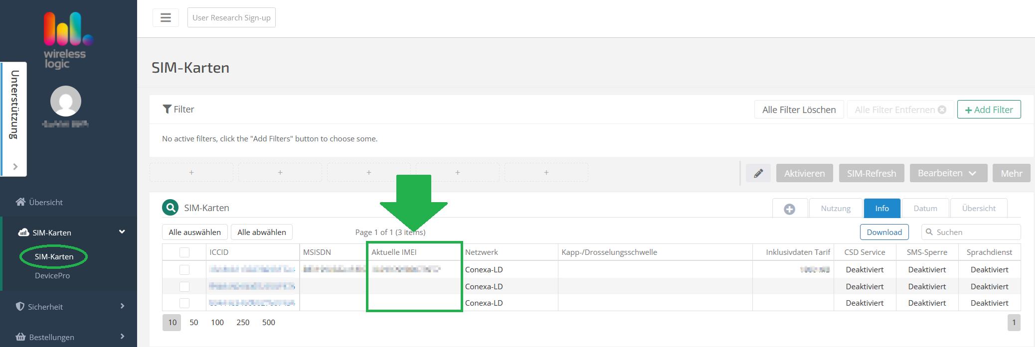 Wenn unser System die IMEI des Mobilfunkgeräts registriert hat, in das die SIM eingelegt wurde, können Sie diese in SIMPro unter SIM-Karten bei Aktuelle IMEI finden.