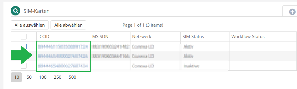 Klicken Sie hier bei der gewünschten SIM-Karte auf die ICCID, um die Details der SIM-Karte aufzurufen.