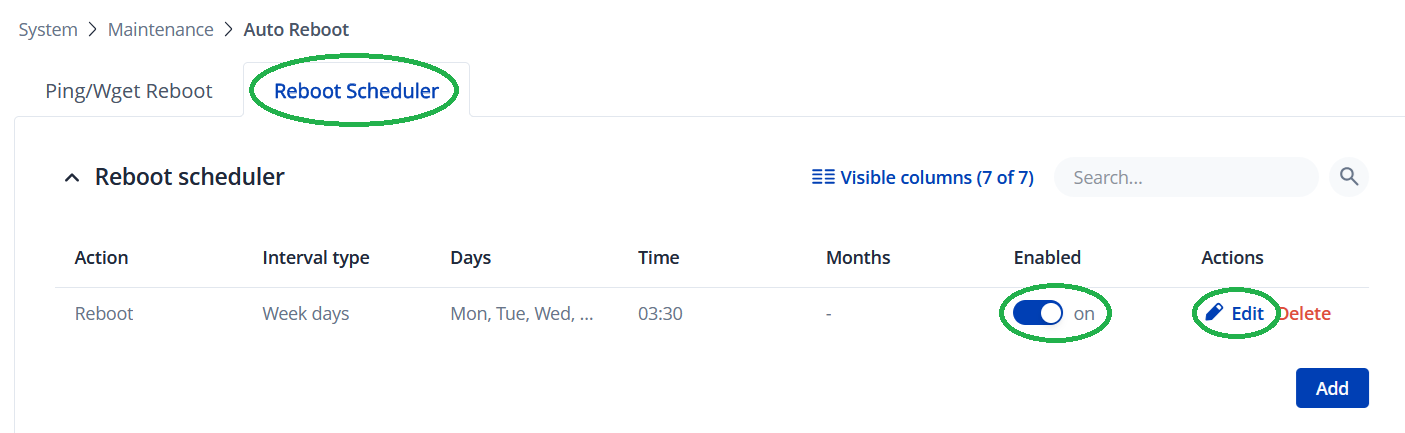 Unter 'System -> Maintenance -> Auto Reboot' im Tab 'Reboot Scheduler' lässt sich der Neustart des Routers einrichten, anpassen oder auch deaktivieren.
