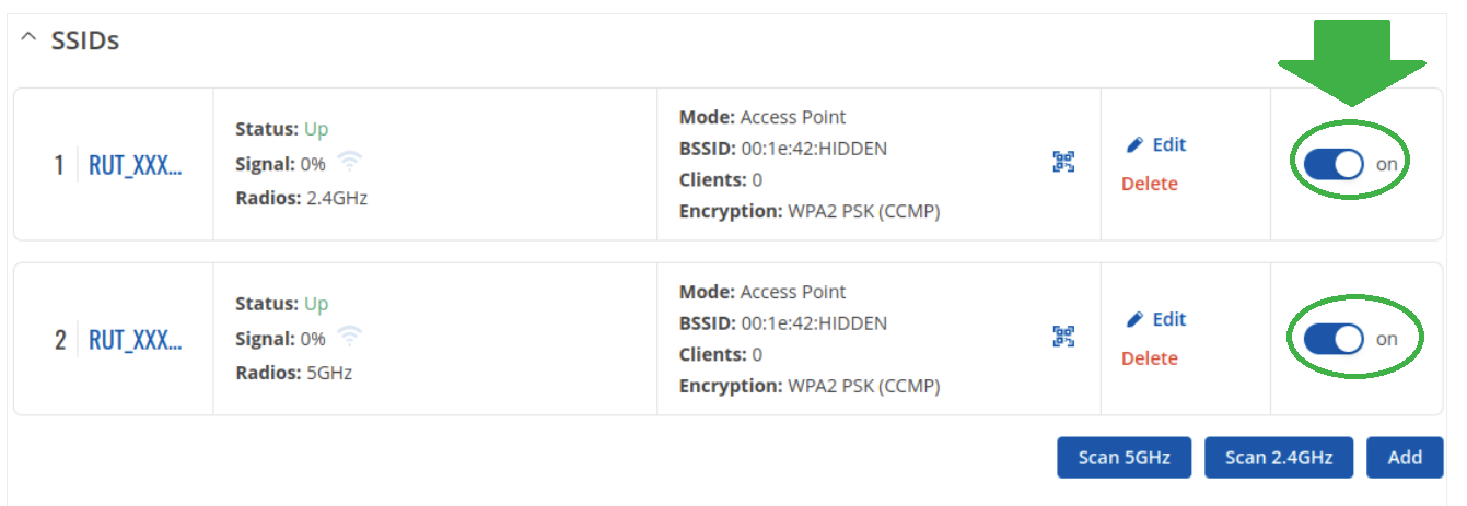 Im Teltonika Router unter dem Menüpunkt "Network -> Wireless -> SSIDs" kann das WLAN (WiFi Access Point) aktiviert oder deaktiviert werden. Abhängig vom Router-Modell steht hier entweder ausschließlich das 2,4 GHz-Band oder zusätzlich das 5 GHz-Band zur Verfügung.