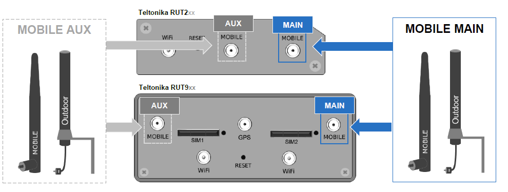 For routers of the RUT2 and RUT9 series, both antenna sockets on the panel are labelled as MOBILE. To identify the respective antenna socket see illustration:
