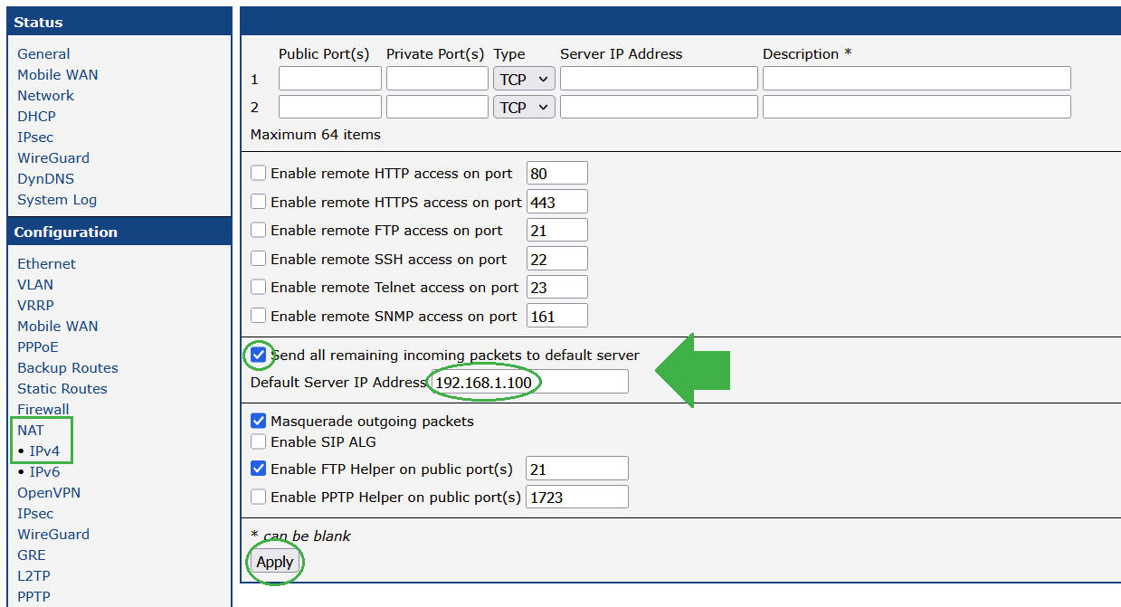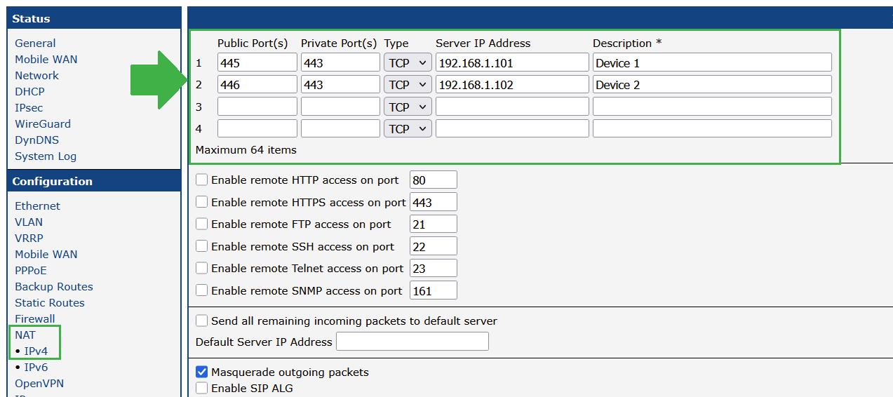 Under Configuration -> NAT -> IPv4 a port forwarding for the required port to connected devices can be set up. This is especially recommended if multiple devices are connected via the SIM card using different ports or, for security reasons, only the required ports of a device should be accessible.