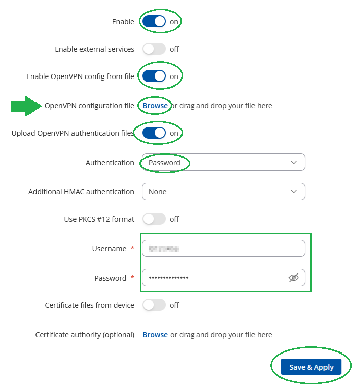 - Import the previously downloaded OpenVPN configuration file with the following settings at 'OpenVPN configuration file' in the router and add it with 'Save & Apply'.