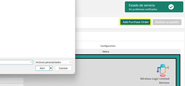 Haga clic en el botón “Add a purchase order” en la parte derecha superior de su pantalla para que se abra la nueva ventana y pueda adjuntar el documento requerido.