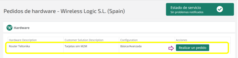 Le aparecerá la plantilla para contratar los modelos de routers y tipos de tarjeta sim necesarias. Debe seleccionar la casilla “realizar un pedido” para avanzar a la siguiente pantalla.
