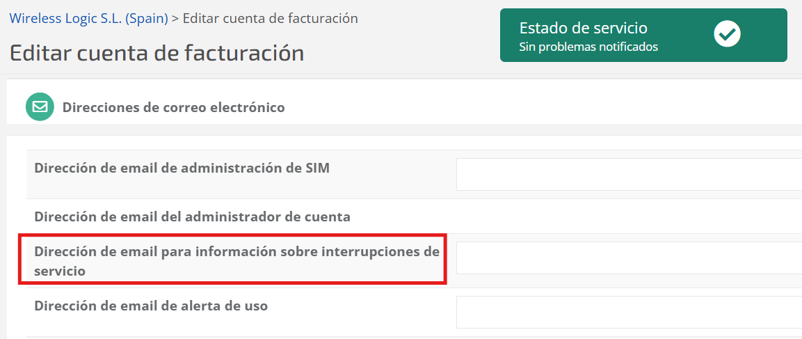 Desplácese hacia abajo hasta la sección de direcciones de correo electrónico y añada su dirección de correo electrónico a la casilla de dirección de email para información sobre interrupciones de servicio: