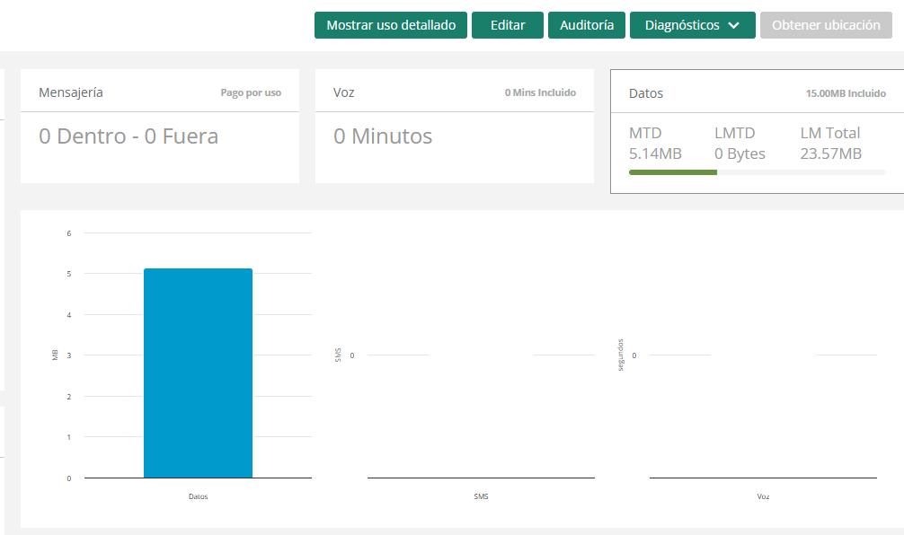 En esta sección encontrará un panel con información detallada sobre el consumo de datos, SMS y voz. Además, podrá consultar diferentes métricas de uso:
